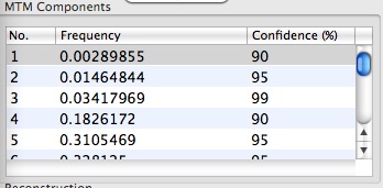 This table will contain list of the frequencies of highly significant signals (greater than the 90% level ) either from MTM spectrum, MTM harmonic test or MTM coherence, which can be selected for subsequent MTM reconstruction.