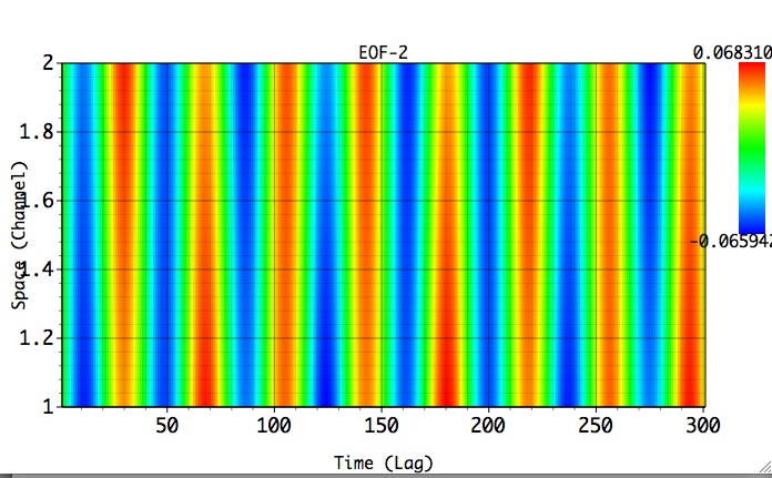 Low-frequency part of the spectrum contains two oscillatory EOF pairs which correspond to smooth quasi-periodic signal in both channels. These pairs can be inspected visually by opening Advanced panel, selecting 2nd and 3rd r rows in MSSA Components table, and using Plot EOFs with 2-D Fill plot option. We can readily see that this dataset is dominated by in-phase and out-of-phase oscillatory components.